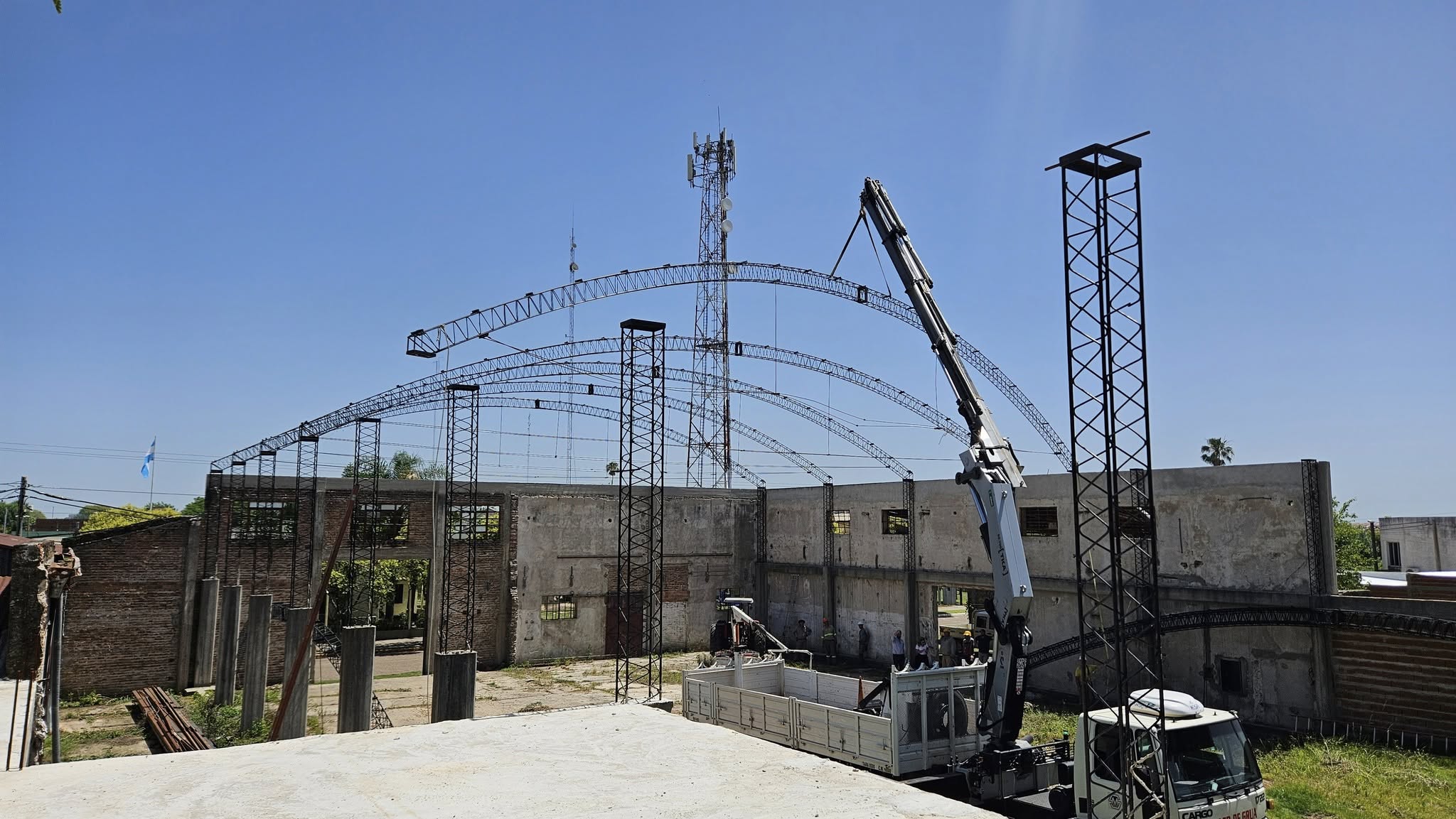 En la mañana de este miércoles, la Municipalidad de Los Charrúas avanzó con una etapa clave en la construcción del estadio municipal: la colocación de las cerchas parabólicas que comenzarán a definir la estructura del esperado espacio deportivo y recreativo.