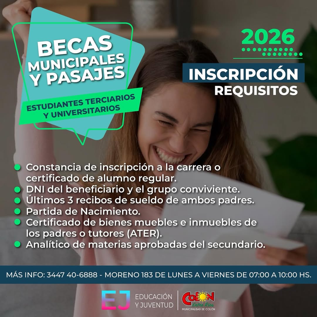 La Municipalidad de Colón, a través del Área de Educación y Juventud, abre la convocatoria 2026 para la inscripción y renovación de becas estudiantiles y pasajes destinados a jóvenes que cursan carreras terciarias y universitarias, con el objetivo de acompañar la continuidad de sus estudios y aliviar los costos de traslado y formación.