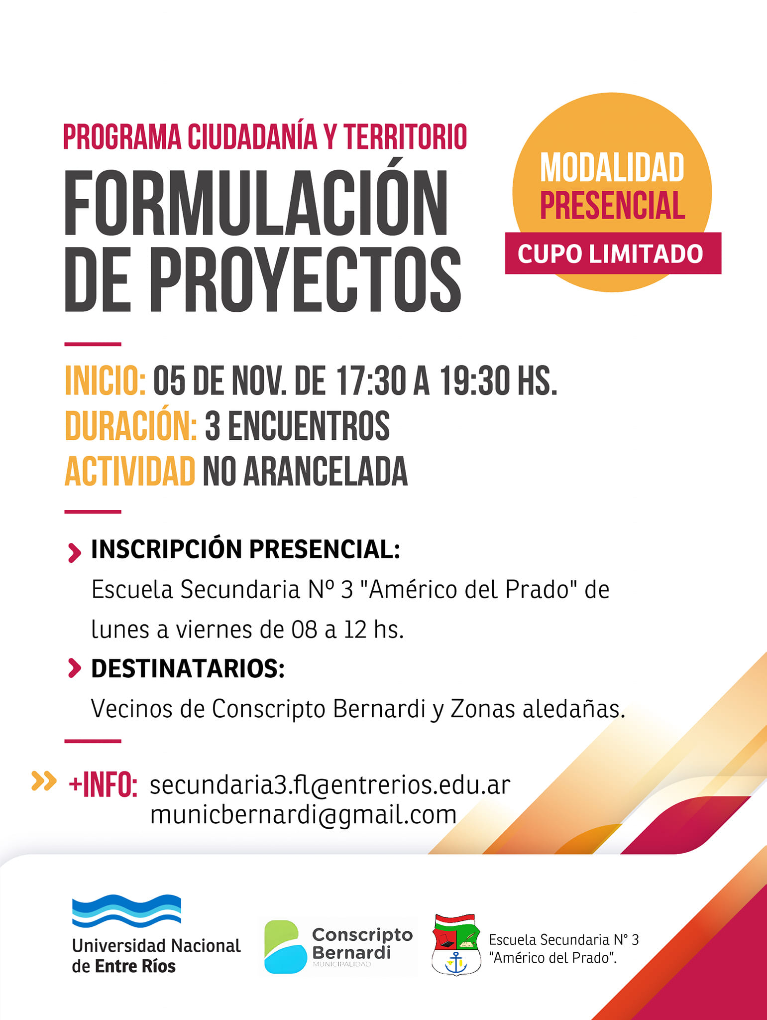 La Secretaría de Extensión Universitaria y Cultura de la Universidad Nacional de Entre Ríos (UNER) presenta el Taller «Formulación de Proyectos» en el marco del Programa Ciudadanía y Territorio, con el objetivo de promover la participación ciudadana y el desarrollo de proyectos socio-productivos locales. Esta propuesta se lleva a cabo de manera conjunta con este municipio y la Escuela Secundaria N° 3 «Americo del Prado».