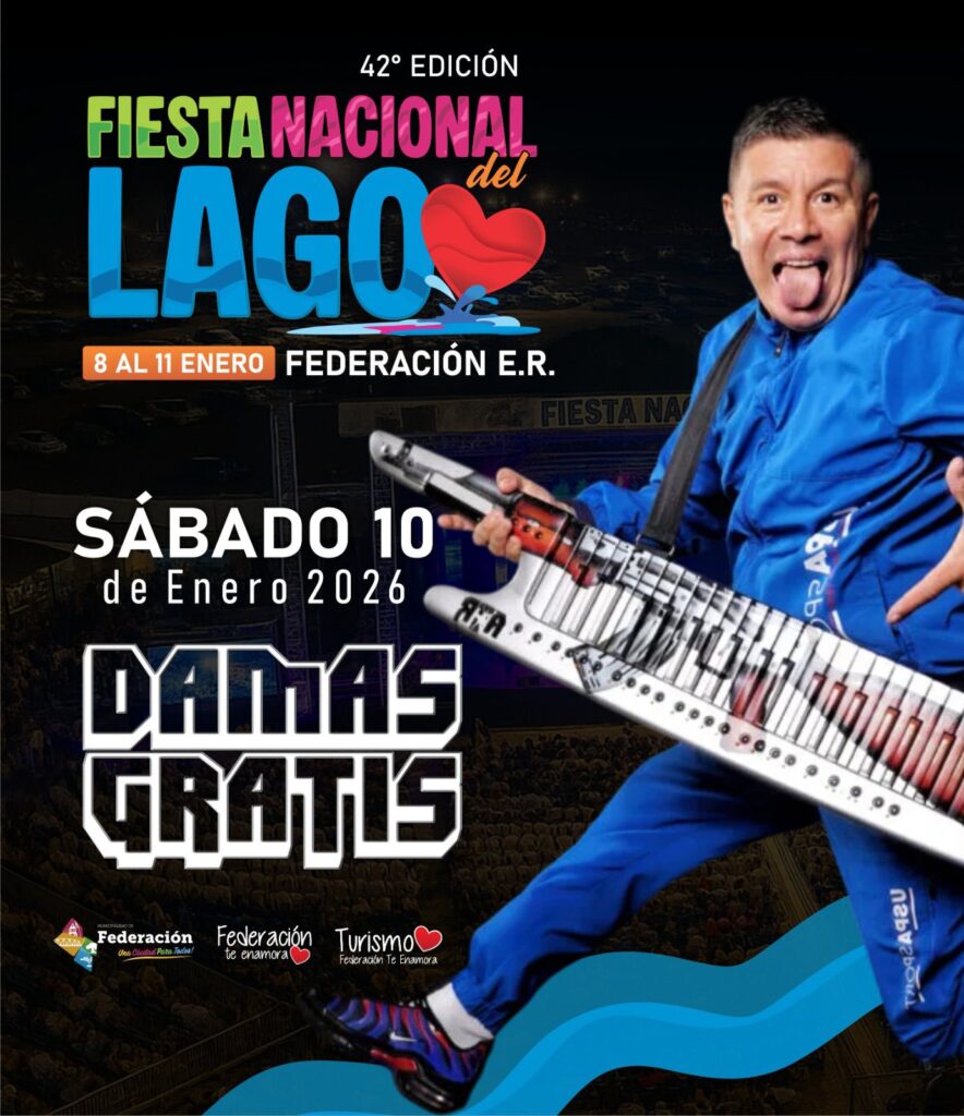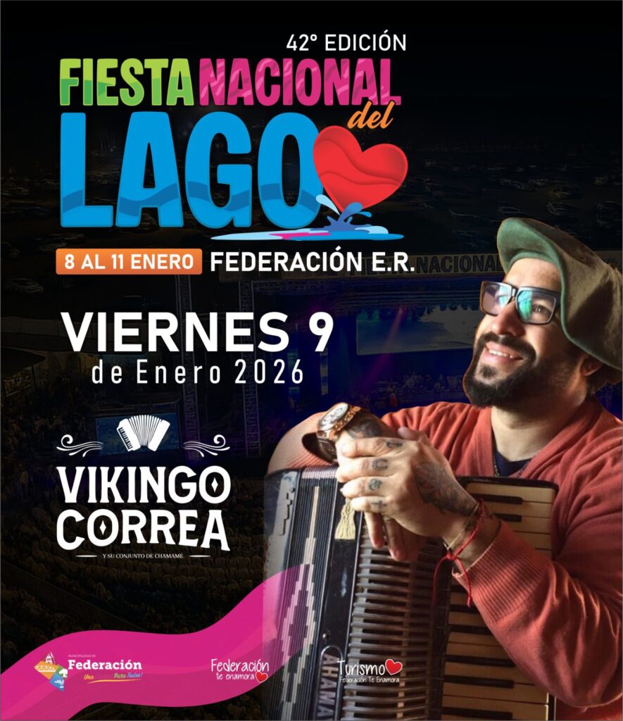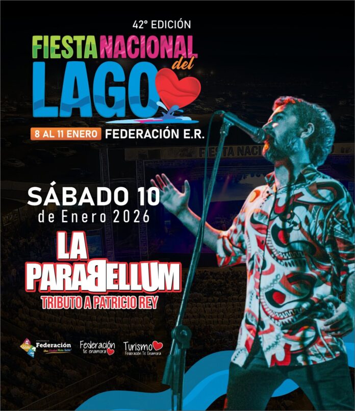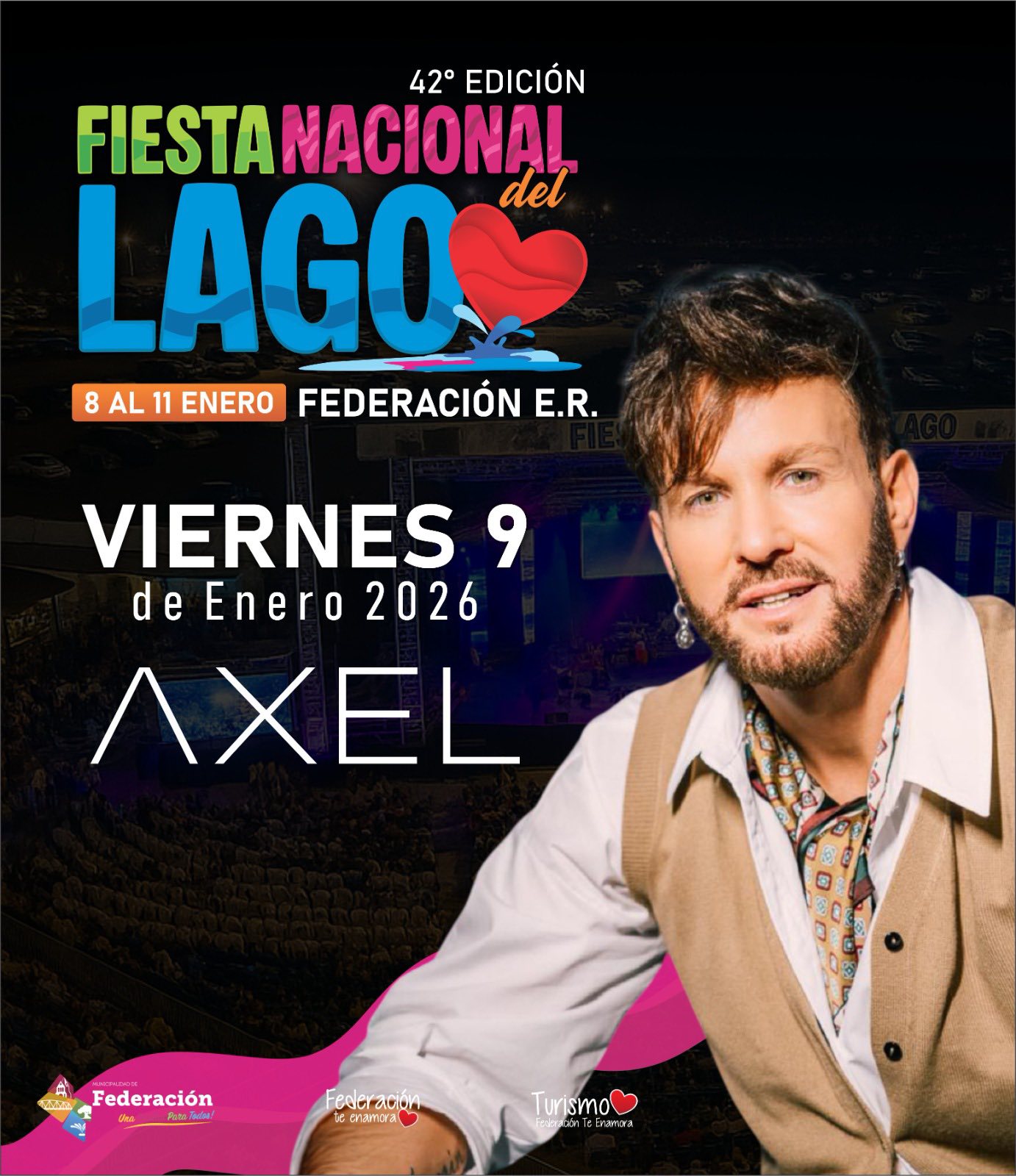 El Presidente Municipal de la ciudad de Federación Ricardo Bravo, anunció la grilla para la edición 2026 de la Fiesta Nacional del Lago, que se llevará a cabo entre los días 8 y 11 de enero de 2026 en la ciudad termal. El Intendente Bravo, días atrás, ya había anunciado la presencia de KPersonajes y Damas Gratis y ahora llegó la grilla completa con importantes artistas como AXEL, Pinki – “Un Poco de Ruido”, El Vikingo Correa y La Parabellum.