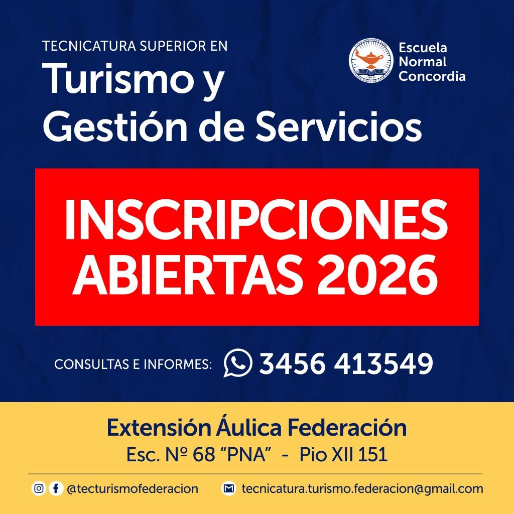 El Municipio de Federación anunció la apertura de las preinscripciones para la Tecnicatura Superior en Turismo y Gestión de Servicios, una propuesta académica gratuita que comenzará a dictarse en el ciclo lectivo 2026.