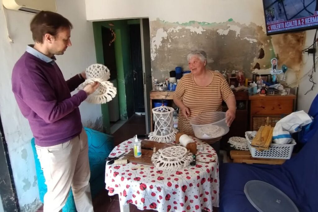 También, la visita incluyó a Griselda Mercado, que es una artesana del macramé que incorpora piezas de piedras naturales y artesanías en caña. “La Rusa”, como es reconocida en las ferias desde sus comienzos, hace más de 25 años que se dedica a trabajar y crear artesanías en macramé. “Las mismas le dieron la posibilidad de sacar adelante a su familia, generando su propia fuente de trabajo y sosteniendo la economía familiar. Ella hace diferentes tipos de pulseras, collares, tobilleras de diferentes diseños y técnicas, colores variados, con piedras o sin ellas, sahumadores en caña, atrapa sueños, entre otros”, cuenta Almeida.