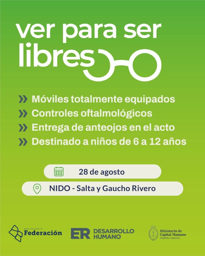 La Municipalidad de la ciudad de Federación anuncia que llega a la ciudad el Programa Nacional de controles oftalmológicos «ver para ser libres», destinados a niños y niñas de 6 a 12 años y comunica que hay turnos disponibles.