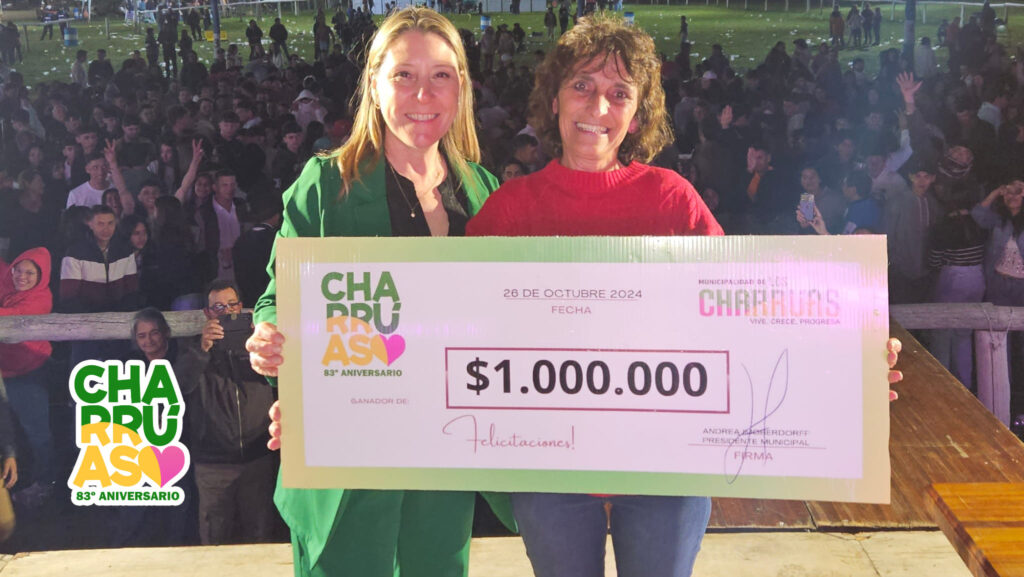 La noche continuó con el sorteo del viaje cortesía de «Amcabi Turismo», donde el ganador fue de la localidad de Concordia, Bergunian Juan. Y la gran ganadora del millón, que quedó en la localidad, fue Rosana Quiroz, vecina de Los Charrúas. También se sortearon 3 vouchers de combustible de $50.000 cortesía Galarfoch.