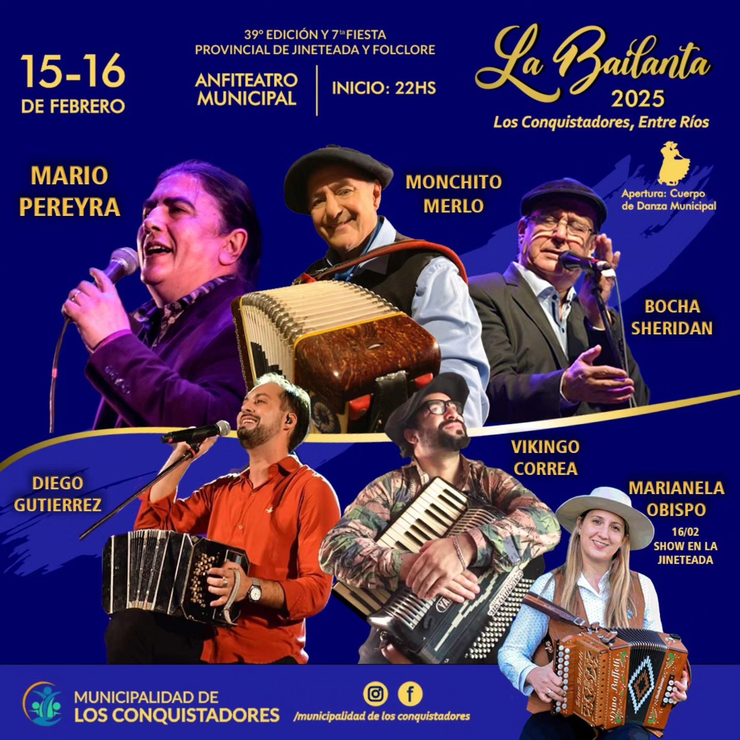 Actuará el Cuerpo de Danza Municipal, Bocha Sheridan, Vikingo Correa, Diego Gutierrez, Monchito Merlo, Mario Pereyra, y la actuación de Marianela Obispo el día domingo en el predio de la jineteada.
