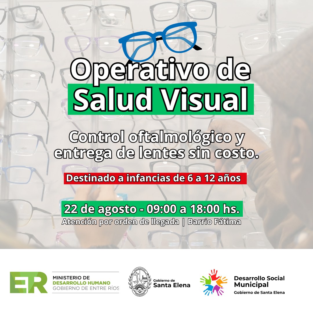 El Ministerio de Desarrollo Humano de Entre Ríos, en articulación con el Ministerio de Capital Humano de la Nación y la Municipalidad de Santa Elena, llevará adelante el programa oftalmológico “Ver para ser libres” el próximo 22 de agosto, destinado a niños y niñas de 6 a 12 años.